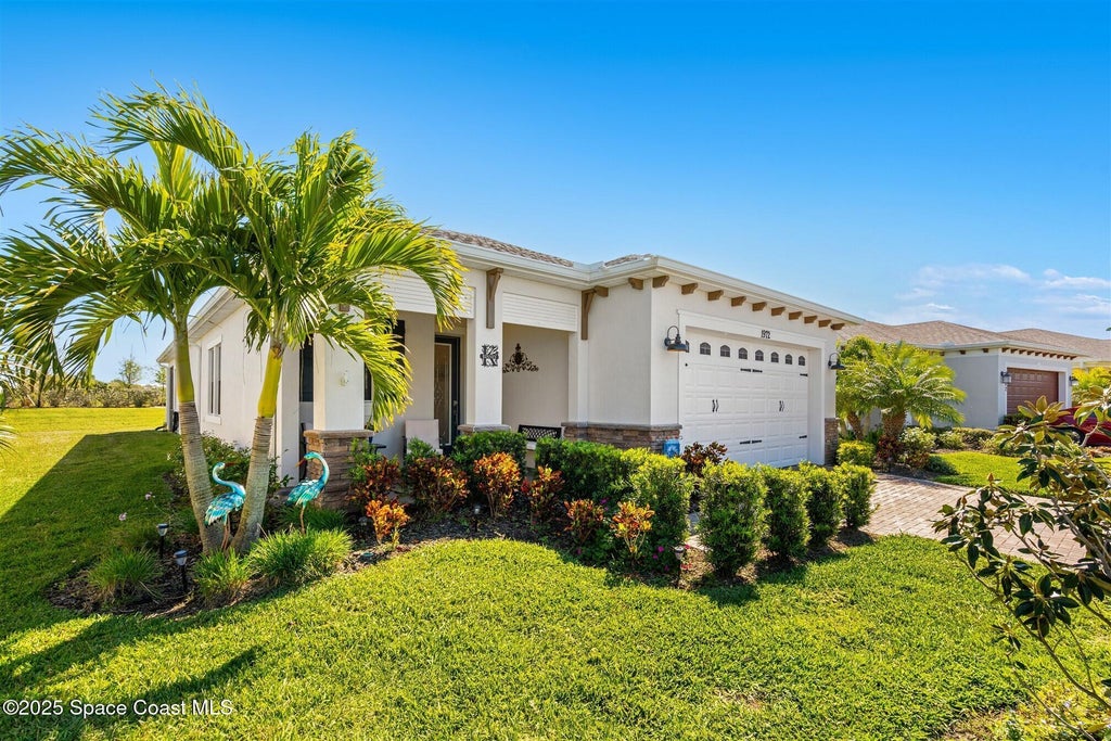 From the exterior with stone accents and inviting front porch to the screened-in lanai, this 2 bedroom plus flex room home in Bridgewater, Viera's sought after 55+ resort style community, epitomizes Florida living! Decorated in today's sought after palette of whites and grays, this ''open floor plan'' home checks off all the boxes. White kitchen cabinets, upscale backsplash, undercabinet and pendent lighting, marble look quartz counters in kitchen and baths, new porcelain tile flooring throughout (no carpet!), and elegant crown molding in main areas and bedrooms are the highlights of this home! New Palm Trees in backyard July 2025! The state-of-the-art refrigerator brews your favorite coffee before you retreat to the front porch or the screened in rear lanai. The HOA provides lawn care and includes a stunning private clubhouse, complete with heated pool and spa, fitness center, tennis and pickleball courts, billiards room and its own movie theater! Close to shopping & restaurants!