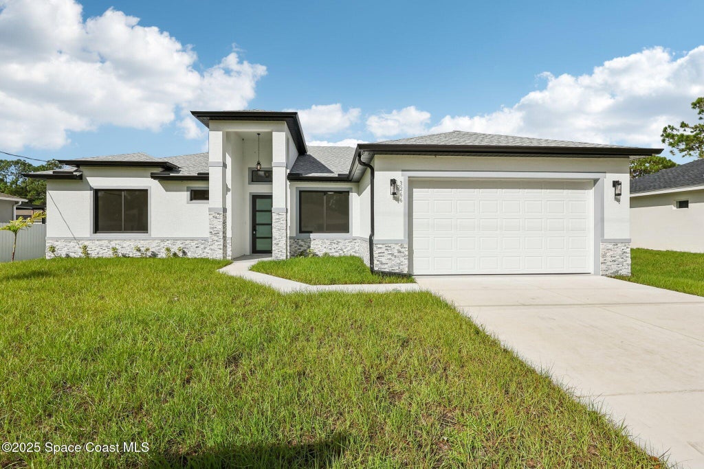 Move-In Ready! Experience the perfect blend of modern elegance and functionality in this stunning 4-bedroom, 3-bathroom home, complete with a flexible office space and a convenient laundry room. Built with hurricane-rated windows and a striking stone façade, this home is as durable as it is stylish. Inside, the open-concept layout is designed for effortless entertaining, featuring a gourmet kitchen with a quartz waterfall island, farmhouse sink, stainless steel appliances, built-in microwave. Soft-close cabinets with glass accents and a wet bar—add a sophisticated touch, perfect for hosting. Spanning 2,018 sqft, the home boasts wood-look tile flooring throughout—no carpet! The luxurious primary suite offers a spa-like retreat with a soaking tub, dual sinks, a walk-in shower, and a spacious closet.