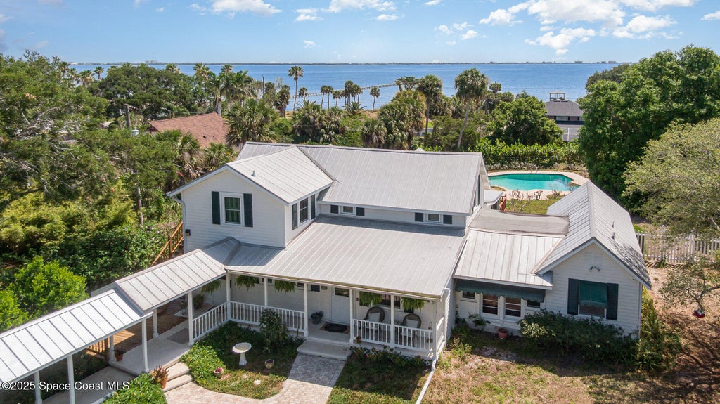 PRICE CHANGE!!!! Nestled on a generous 0.86 acre lot, welcome to this 4-bedroom, 3-bath residence with no HOA. Relax on the inviting front porch or stroll through the breezeway to your detached double garage. Need space for an RV? There's ample room next to the shed, which is equipped with both electric and water. Inside, you'll find beautiful wood flooring and an open-concept floor plan that creates a warm and welcoming atmosphere. The kitchen boasts stainless steel appliances, butcher block countertops by the stove, and a Corian counter on the island. A unique spiral staircase leads to the upper level, where three bedrooms, a bath, and breathtaking views of the Banana River await. Step outside to enjoy the enclosed covered patio, which opens onto an outdoor deck overlooking a large, sparkling saltwater pool.