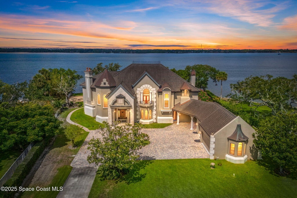 Tucked within the prestigious Hacienda Del Sol Estates on historic Bagger's Point, this 3-story French-Norman estate offers nearly 6,800sq ft of timeless elegance and craftsmanship. Set at the end of a private cul-de-sac, this 5 bedroom, 6 bath home captures the spirit of Merritt Island's rich history while delivering architectural distinction. Inside, a dramatic staircase leads to a soaring tower ceiling adorned with intricate woodwork, while a full custom wood library offers a stately retreat. The arched window foyer floods the interior with light and frames sweeping views of the meticulously landscaped grounds and shimmering Intracoastal waters. From the stunning architecture to the unforgettable outdoor spaces, this is a home designed for those who appreciate beauty, legacy, and the allure of waterfront living. ***Please note that there are security cameras both inside and outside the property***