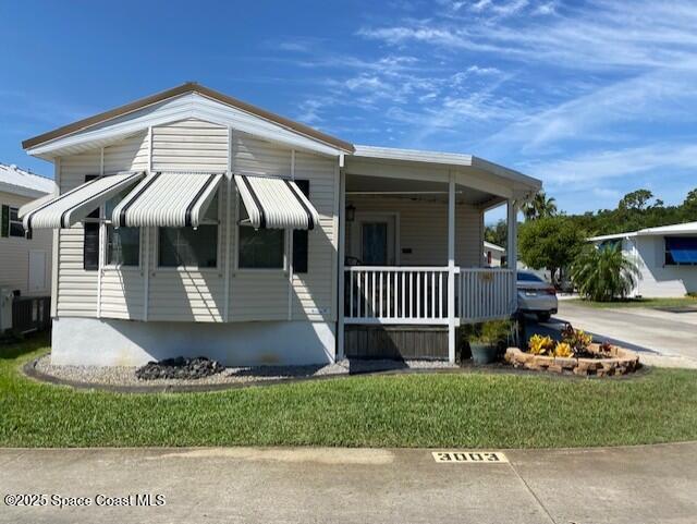 This park model with addition under AC is just what you need for seasonal or year round resort living. Corner lot and enjoy coffee on the open front porch. Park your golf cart or motorcycle in the 80 sq ft attached garage. AC is two years old with Ultraviolet Air Purifier added in 2024, metal roof and vinyl plank flooring throughout. Active 55+ community close to airports, theme parks, beaches, shopping and restaurants. Gated property with executive golf course, clubhouse, heated pool, pickleball and more. Watch rocket launches from your front porch.