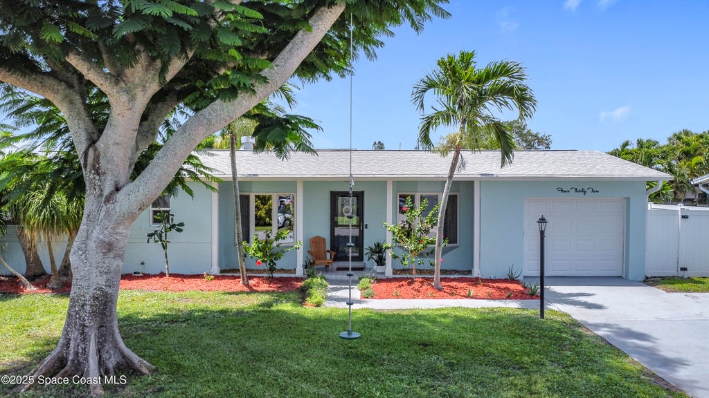 DON'T MISS OUT ON THIS ONE! Sun, Sand & Style - Enjoy the best of Florida living in this beautiful, FULLY RENOVATED IN 2023, This 3 bed, 2 bath beachside home is ideally located in an A+ school district. Designed for relaxed coastal living, this home features white shaker cabinets, quartz countertops, stainless steel appliances, whole home filtration system, recessed lighting, & modern tile flooring throughout. Both bathrooms showcase sleek, contemporary finishes. At the heart of the home is a rare 360-degree wood-burning fireplace, perfect for cozy gatherings. A built-in office with shelving adds function & flexibility. Neighborhood boat launch. CAST IRON PLUMBING REPLACED with PVC, as well as the roof, a/c & ductwork. Step outside to a fully fenced yard with lush tropical landscaping, shed for added storage, & 2 separate patios—perfect for entertaining or unwinding after a day at the beach. This move-in ready gem delivers comfort, quality, and a true coastal lifestyle!