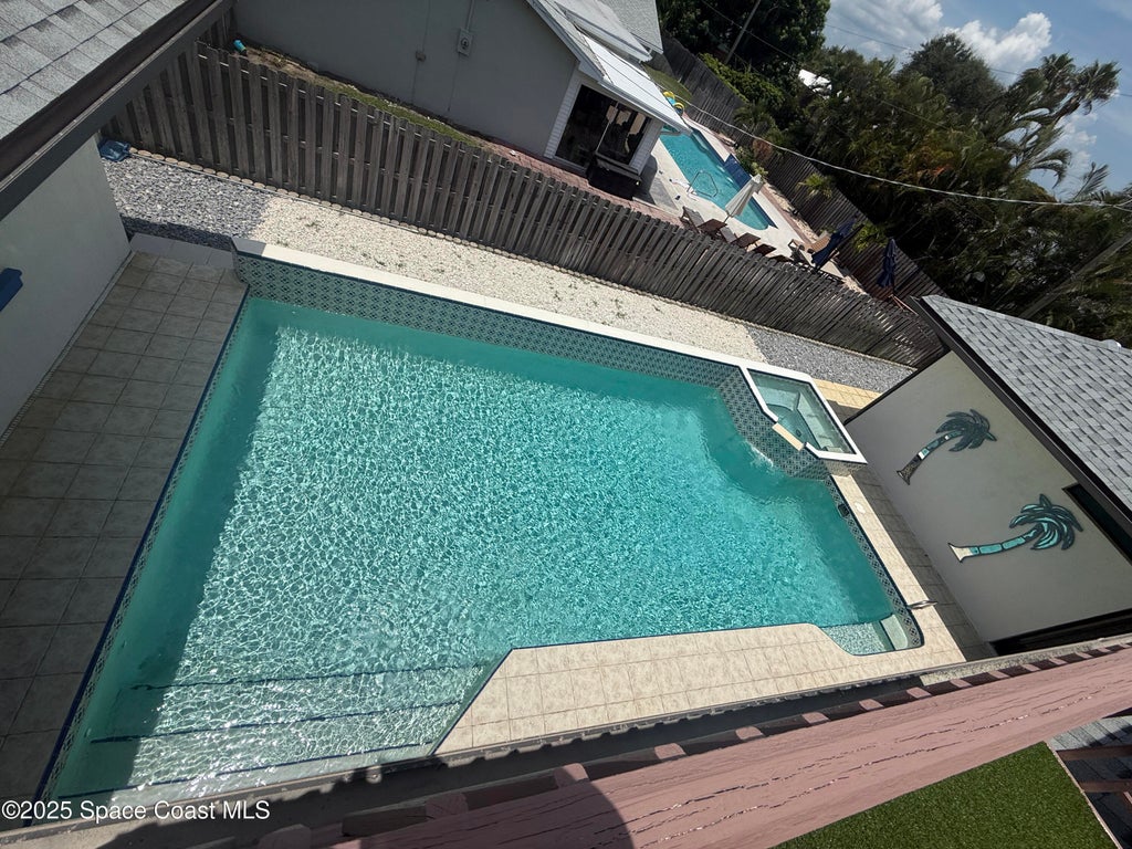 Just 1.5 blocks from the beach, this beautifully maintained 3-bed, 3-bath home offers the perfect blend of comfort & coastal charm. A 2nd-story loft with its own balcony—can easily be enclosed to create a 4th bedroom, ideal for growing families. The detached 1-bed/1-bath efficiency bungalow adds flexibility for multi-gen living or a private home office. Step into the serene courtyard featuring a large pool & spa, perfect for relaxing or entertaining. Inside, you'll find vaulted ceilings, open floor plan, & a primary suite with patio access, a walk-in closet, jetted tub, & separate shower. Built in 2000 w/concrete block construction, this home boasts recent upgrades: 2023 roof, 2024 A/C, & new water heater. Miami-Dade hurricane shutters offer added peace of mind. Located just blocks from top-rated schools, shopping, & dining, this one-owner home is a rare find in Satellite Beach. Whether you're seeking a family home or a second home by the sea, 240 Sheridan is ready to welcome you!