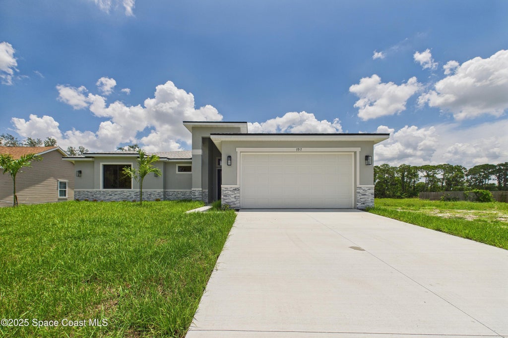 SELLER OFFERING $10K IN CONCESSIONS and an upgraded appliance package including washer and dryer. This home is perfect for multigenerational living, featuring a separate entry and private bathroom en suite, ensuring both privacy and comfort. Discover modern luxury living in Palm Bay's desirable Bayside area, close to shopping, dining, and more. This new build features 4 bedrooms, 3 full baths, and 2,108 sq ft under air. The sleek kitchen boasts a 9'x4' granite island with dual waterfall edges, Samsung appliances, and custom soft-close cabinets. The open floor plan flows into the dining and living areas, perfect for entertaining. 9.4' ceilings and elegant porcelain tile flooring (no carpet or vinyl) add a spacious feel. The primary suite includes double sinks, a tub, a walk-in shower, and a walk-in closet. Enjoy a covered rear patio with outdoor kitchen utilities ready. This home also includes a 2-car garage, 1-year builder warranty, and 10-year structural warranty.