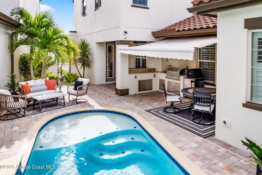 Incredible opportunity and priced to sell!! Move stress free in your FULLY FURNISHED tropical oasis in the heart of Viera! This rare end-unit features a private courtyard with heated saltwater pool, LED lights, and waterfall for ultimate relaxation. The resort-style summer kitchen offers a gas grill, wine fridge, bar seating, retractable awning, and TV mount—excellent for entertaining! The primary suite is on the main level, with two ensuite guest rooms upstairs. Enjoy carefree living with HOA-maintained lawn and exterior painting. Stroll to The Duran Golf Course for a round of golf, The Avenues for a movie, dining or shopping, and coming soon -the Viera Town Center Park Amphitheater for live outdoor concerts and events. Need vitamin sea? The beach is just 13 miles away. This gem is more than a home-It's a lifestyle!