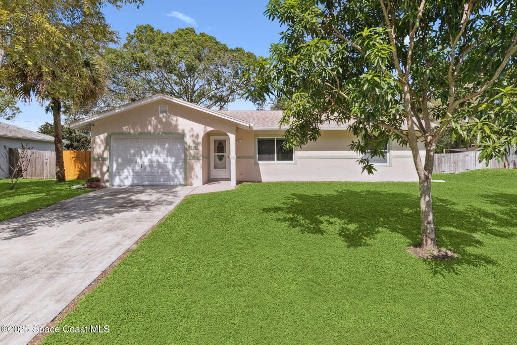 Natural light spills through a broad front window, warming the main living and dining area and setting a calm tone the moment you walk in. The kitchen, outfitted with stone counters and stainless appliances, keeps everything within reach and offers a casual bar for quiet mornings or conversation while cooking. The primary bedroom includes a private half bath with direct access to the full bath—an efficient setup that keeps routines smooth. A second bedroom sits nearby, ideal for guests or a dedicated workspace. Just off the kitchen, an enclosed porch adds year-round living space with views of a fenced backyard—room to garden, unwind, or let pets roam safely. A one-car garage with laundry hookups offers extra function without waste. Recent updates include a 2024 roof and newer A/C, easing future costs. This home favors simplicity, light, and comfort—all in a quiet SE Palm Bay neighborhood with easy access to schools, parks, and essentials. Don't delay! Schedule your exclusive showing! is ready for the next owner.
