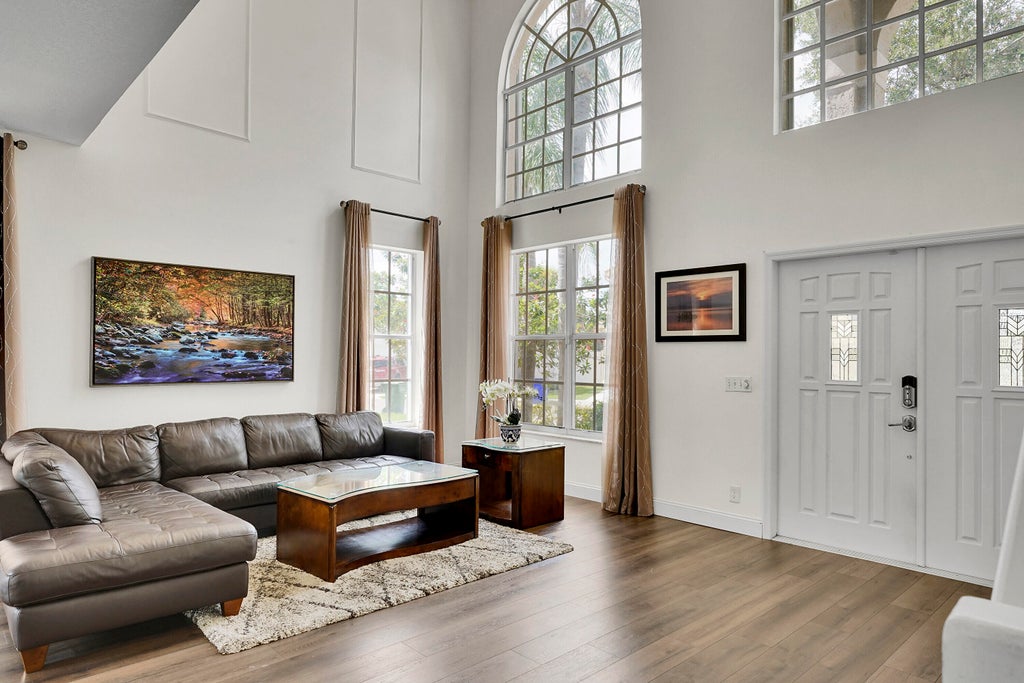 Spacious 4BR, 2.5BA home with 2,226 sq ft. & a 2 car garage with a Tesla charging station! Located in a gated community near shopping & highways. Enjoy peace of mind with a 2021 roof, new 5 ton A/C, and complete accordion shutters. Interior features stunning new luxury waterproof vinyl flooring throughout. New stainless appliances, granite countertops in kitchen, newer impact garage door & impact sliders going to the patio. Half bath downstairs was updated with a floating vanity & LED mirror. Relax in the screened patio-marble floors on the back patio & front patio. Pick fresh fruit from your own fenched backyard with many fruit trees. Perfect blend of comfort, convenience, and security--ideal for modern living!