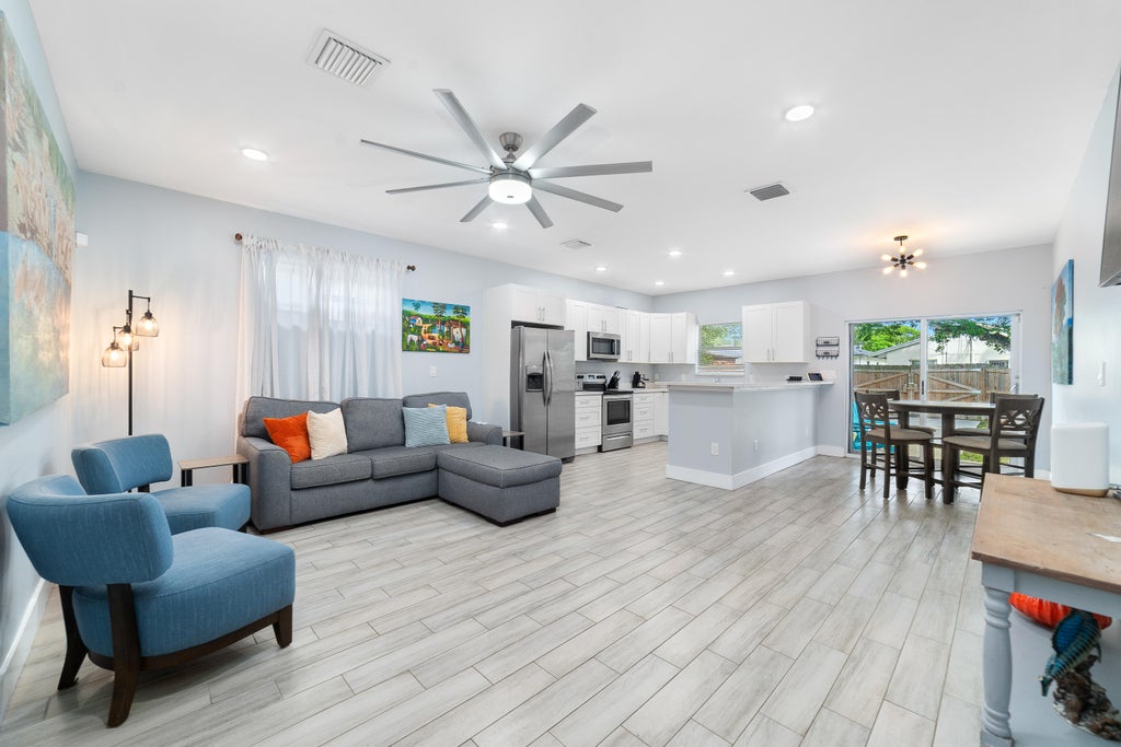 This 2021 new build 3-bedroom, 2-bath single-family home in the Town of Lake Worth offers a modern and comfortable setting. At the heart of the home, the bright kitchen features quartz counters, recessed lighting, and plenty of room for gathering. Tile floors throughout provide a sleek, low-maintenance style, and impact glass windows bring both security and quiet. Recent improvements include landscaping, fresh paint, and a new washer and dryer, along with a regularly serviced HVAC system. The fenced backyard adds a private spot for relaxing outdoors, enjoying a barbecue, or giving pets room to play.With no HOA, you'll appreciate the flexibility to truly make it your own. Conveniently located near downtown Lake Worth, local shops, and dining, this home blends modern design with everyday ease